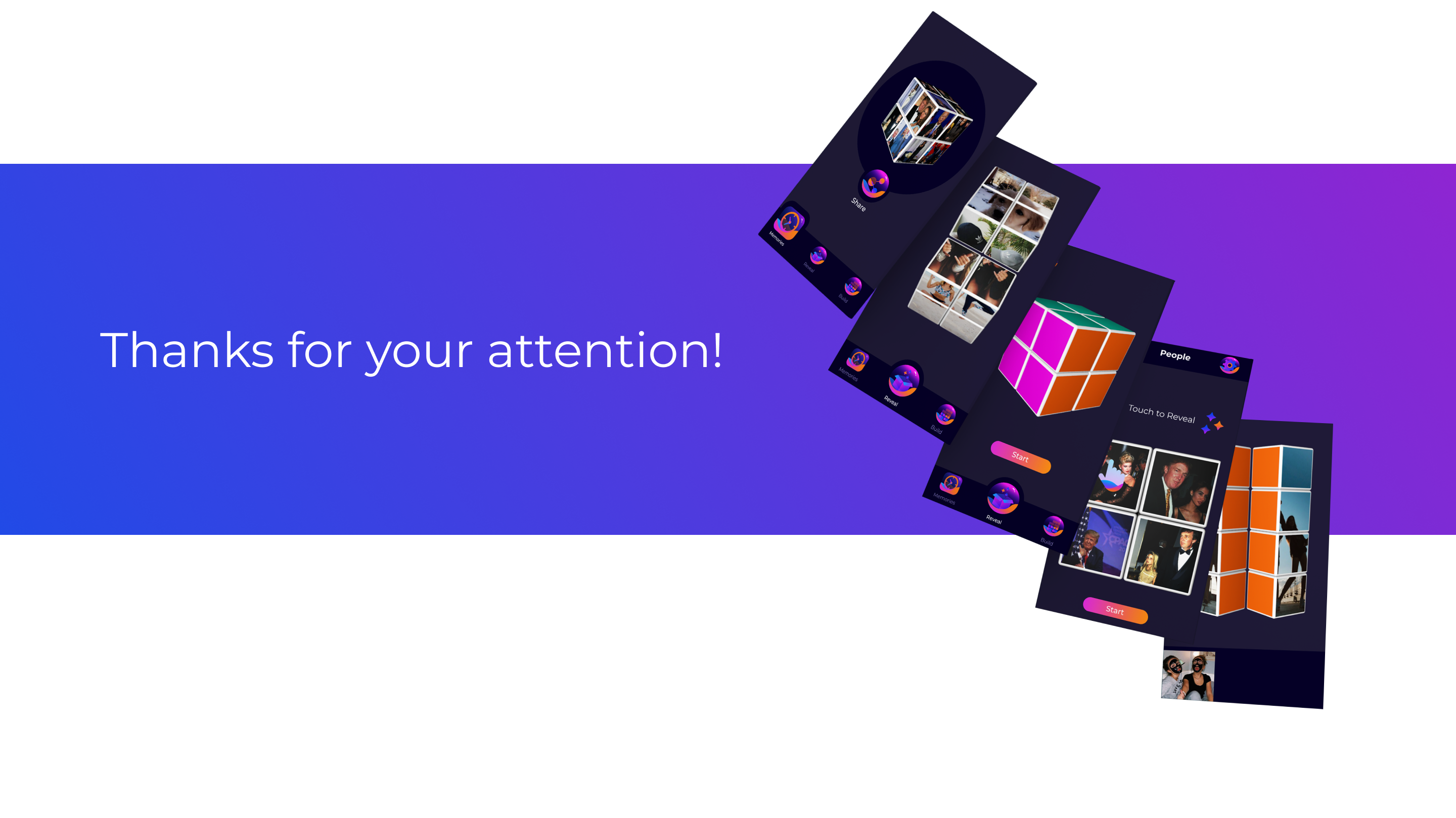 The process of solving a Rubik’s Cube is more like playing a game instead of just looking at albums. The interaction method of this app is different from other photo collection apps. Its innovation and uniqueness can make users feel curious and excited, and at the same time, can stimulate people's desire to take and share photos.